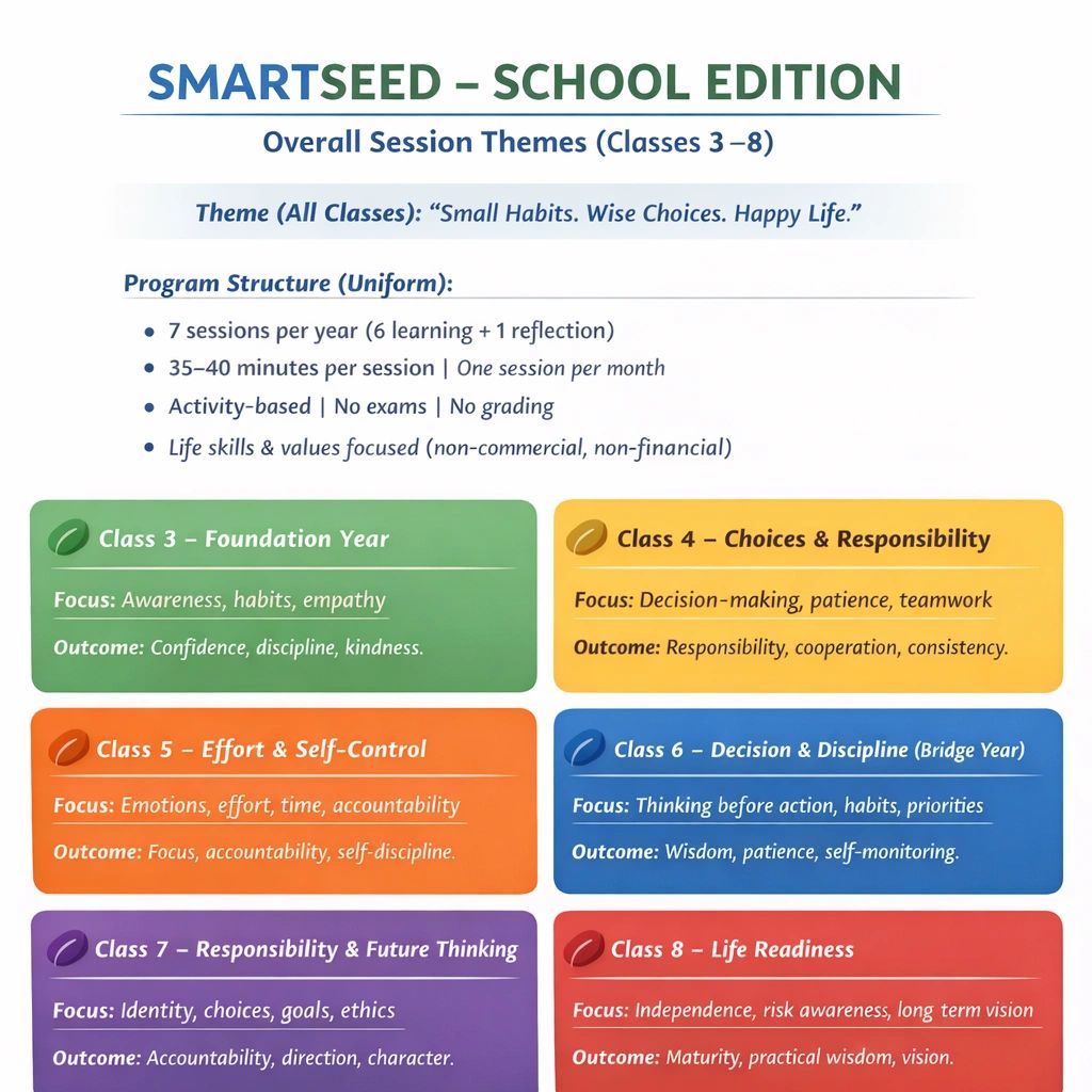 A structured annual program for pre-primary and primary students, focused on instilling foundational financial values. Through theme-based activities and guided learning, it promotes habits like saving, gratitude, and responsible choices—aligned with NEP 2020 to support holistic development and early life skill formation.